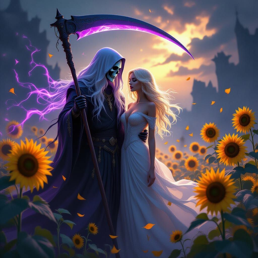 A dark fantasy concept art piece depicting the Grim Reaper with spectral energy and a scythe, beside a blonde woman. Sunflowers wither, releasing souls in a dramatic, ethereal scene with vibrant colors and intense lighting.