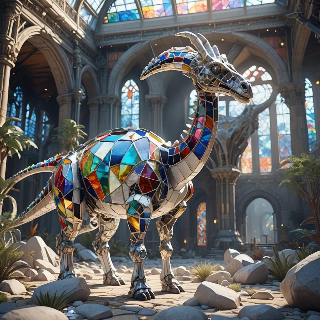 This image shows a biomechanical hybrid of a diplodocus and giraffe standing among white stones. The white creature features stained glass and precise mechanical textures in a futuristic, cinematic style.
