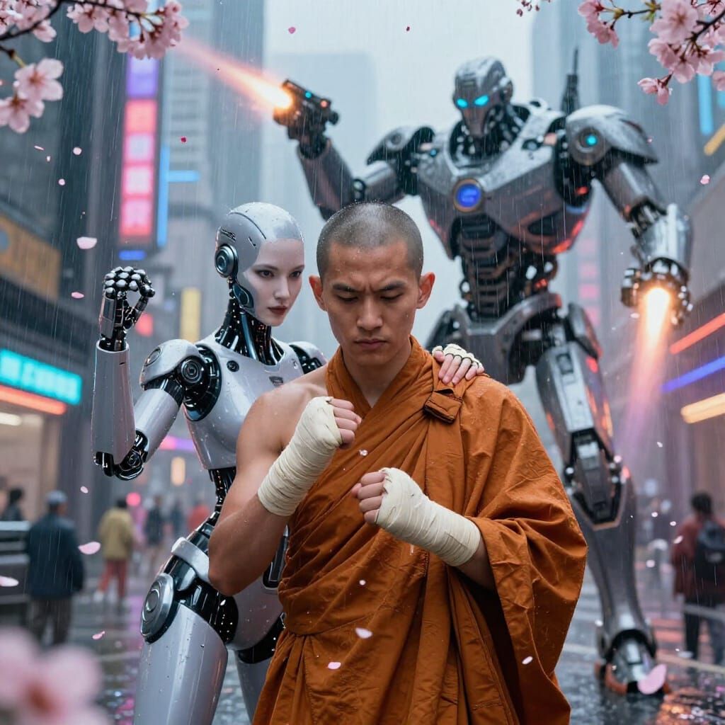 This photorealistic image depicts a Buddhist monk and a gynoid in a high-tech cyberpunk city, under a hail of cherry blossoms and rain, as ray guns fire. Cinematic lighting enhances the scene.