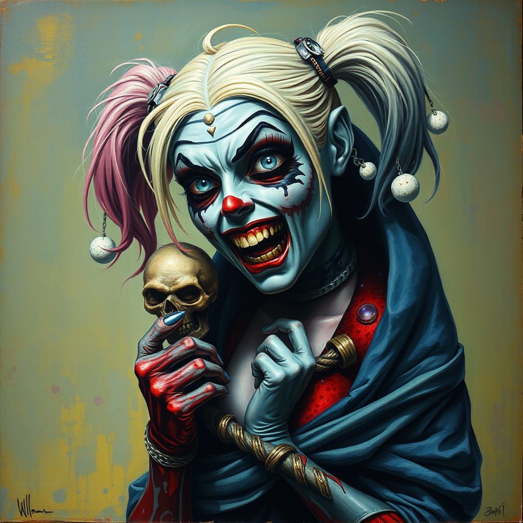 A surreal image of a zombie Harley Quinn holding a teddy bear. The art style evokes melting forms and vibrant colors, in a surrealist style reminiscent of oil paintings.