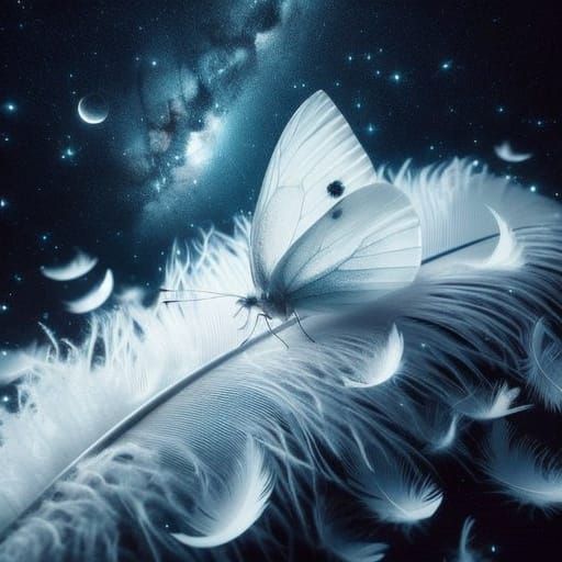 This image showcases a captivating portrait of Bianca sitting on a white feather in a starry night sky, rendered in stunning triadic colors with intricate details and dynamic lighting, reminiscent of a cinematic film still.