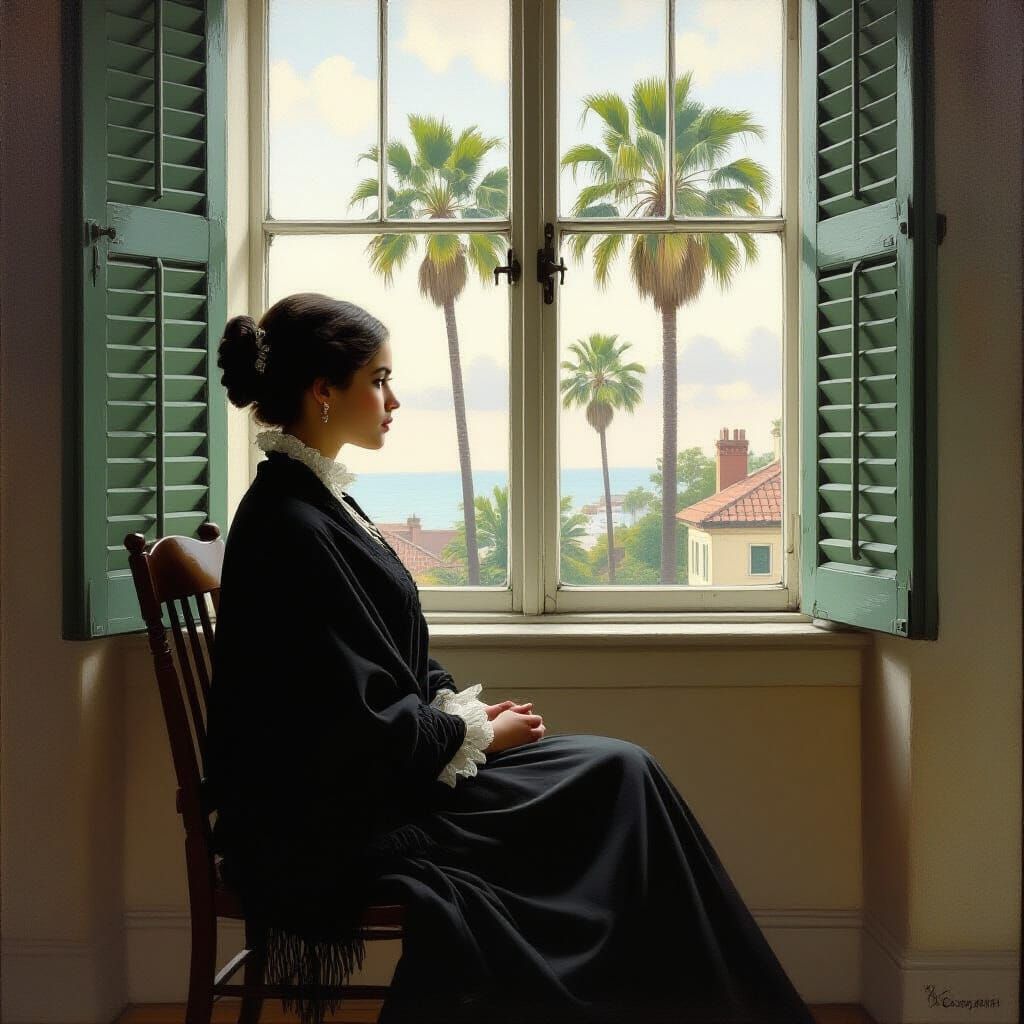 This image shows a young mixed-race woman in Victorian clothing seated by a window. Detailed, painterly art with muted colors and soft light evokes quiet contemplation.