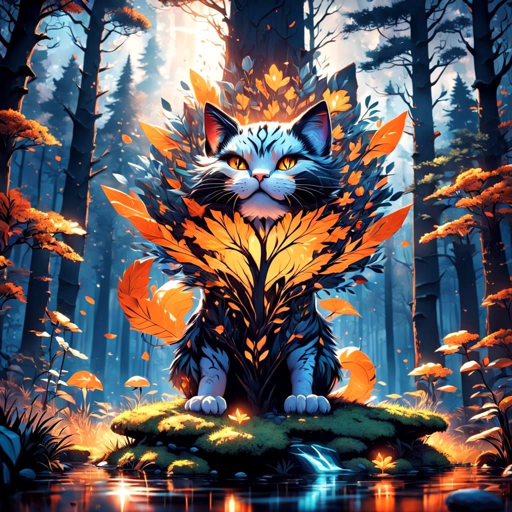 This enchanting image captures a majestic cat lounging on forest rocks, surrounded by lush flowers and mystical energy. Created in a vibrant, triadic color palette, this surreal artwork blends elements of pop art and abstract styles, with intricate details and dynamic lighting effects.