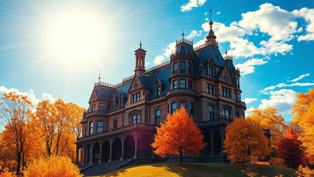 This captivating image shows a grand, Victorian-era mansion with intricately crafted turrets and ornate details, set against a brilliant, full-sun sky and surrounded by vibrant, autumnal trees in warm, golden light. The dreamlike scene blends cosmic surrealism with neo-impressionist sci-fi elements and t...