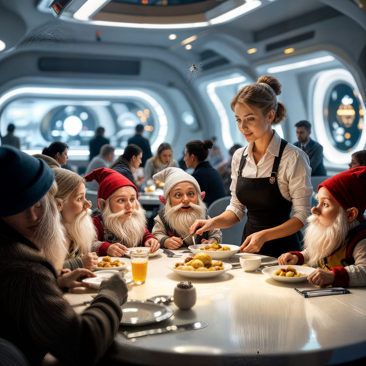 Snežana i sedam patuljaka iz bajke se nalaze u restoranu gde je snežana kelnerica a patuljci su nervozni gladni gosti koji su veoma nestrpljivi. Ostali gosti su obični ljudi kojima smetaju nervozni patuljci. Godina je 2100. Budućnost. Slika je ultra realistična u 4k rezoluciji sa svim detaljima i savršenim ...