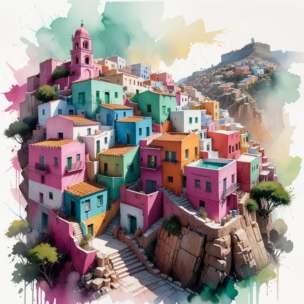 This image shows a vibrant hillside of rainbow-painted homes and cobblestone streets in Guanajuato, Mexico, rendered in a splashy watercolour style with a magenta and emerald palette.