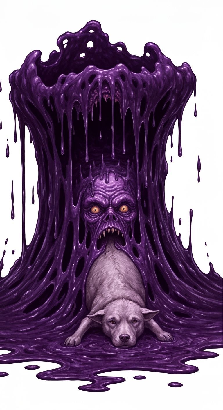This image shows a grotesque, sentient goo monster in dark purple and black hues. A horrifying face emerges as it consumes an unfortunate animal.