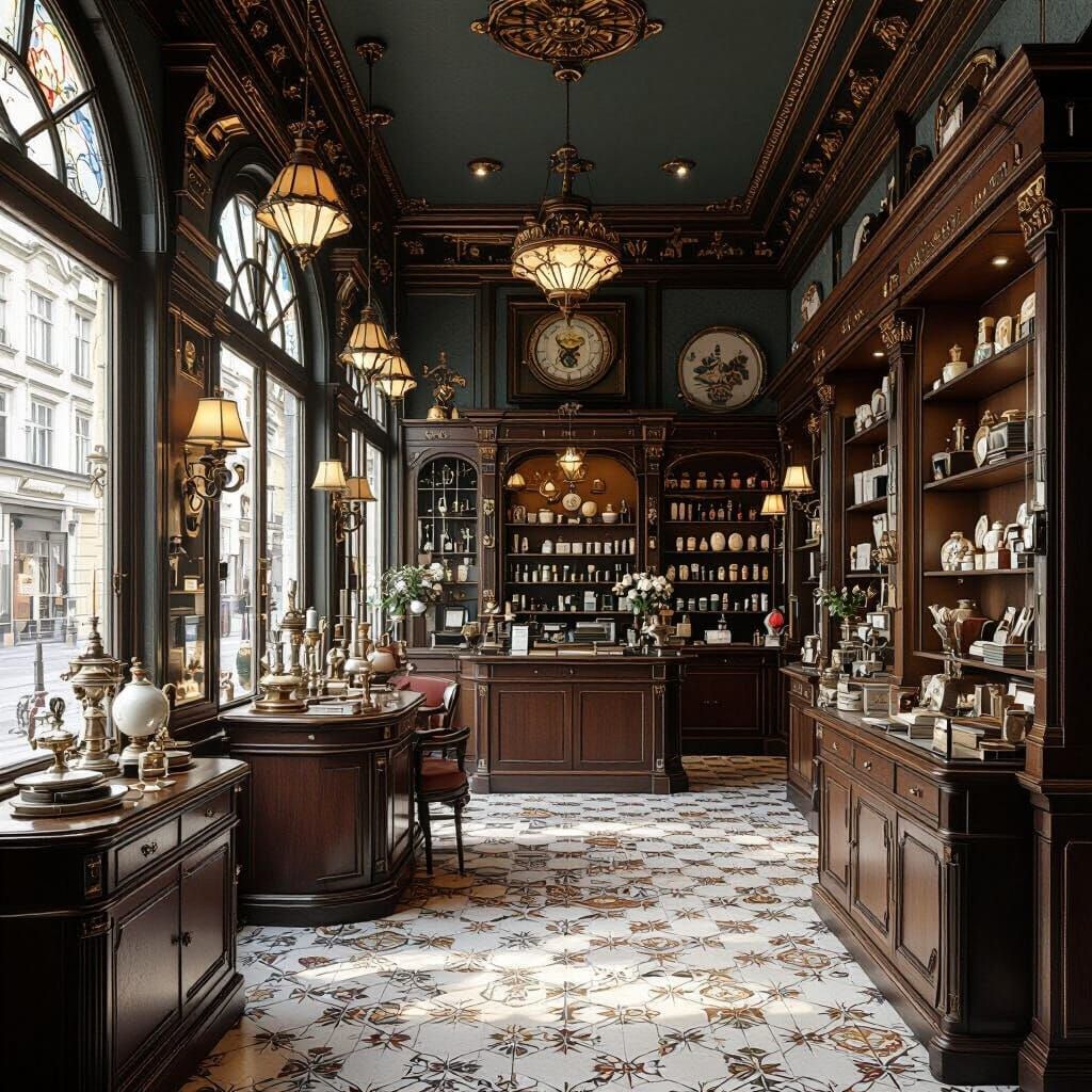This image showcases a highly detailed, fantastical interior of a vintage Viennese glove shop, blending Victorian and 1920s elements with natural morning light. Rendered as a deep color matte painting, it features intricate details and complementary colors.