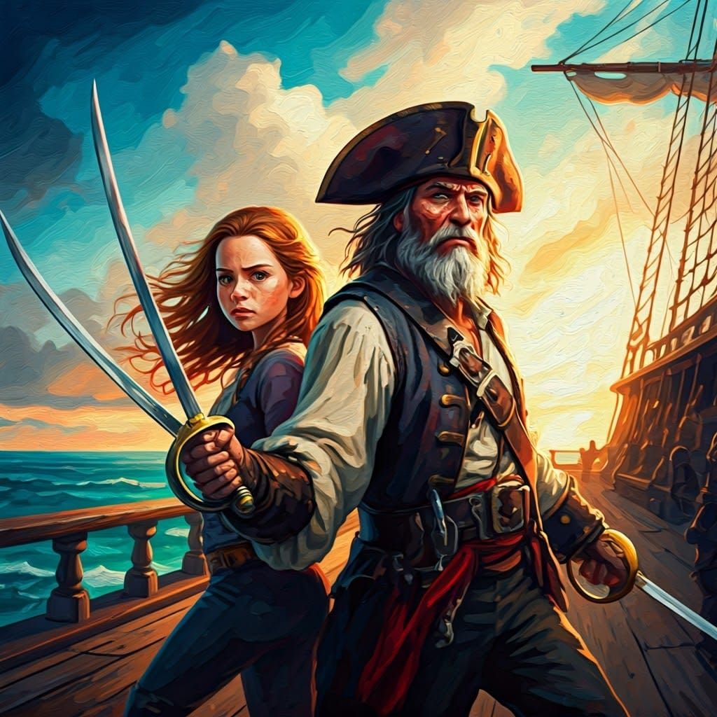 A dynamic, high-contrast oil painting of a pirate captain and his teenage daughter fighting on their ship, set against a turquoise sea and cerulean sky with bold, impasto strokes and vibrant texture, evoking the intense passion and reckless abandon of their pirate life.