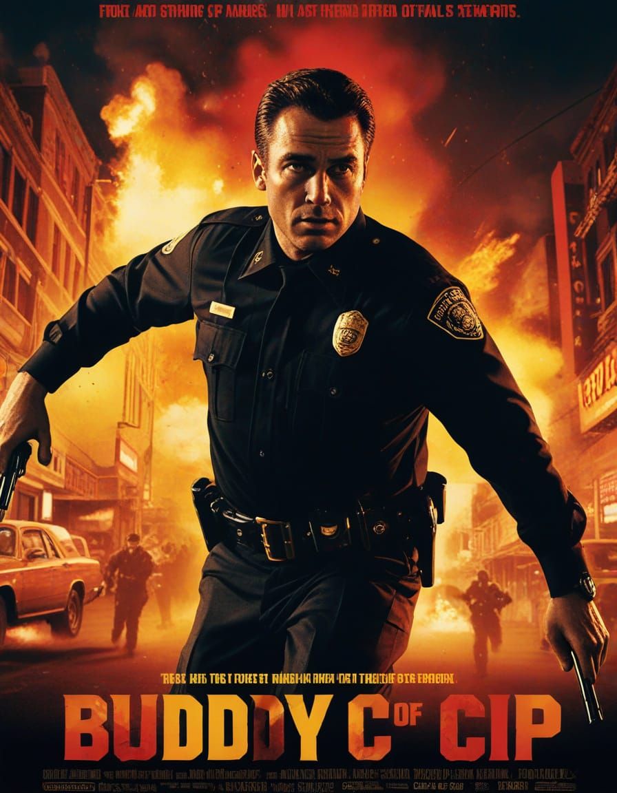 This image shows a cinematic film still of a cop fighting crime amidst explosions of color. It features high contrast lighting and bold typography, reminiscent of a retro action comedy blockbuster.