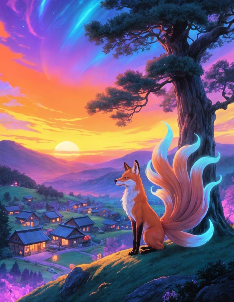 This image depicts a mystical fox spirit on a hill, gazing at a Japanese village. Rendered in a dreamy anime poster style with dazzling neon colors and a synthwave aesthetic.