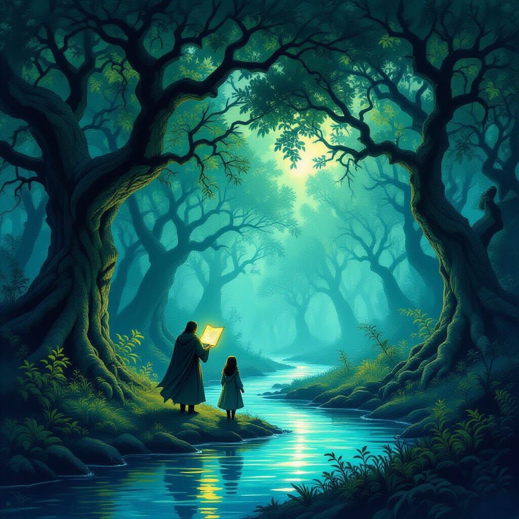 This image depicts Fiamma and Leento venturing through a dark, atmospheric forest illuminated by a magical map. Rendered with dramatic light and shadow, it evokes a sense of unease and intricate detail.