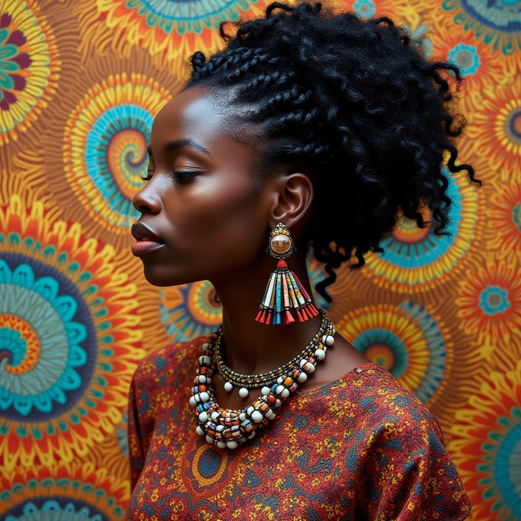 This image is a celebration of African culture, featuring a stunning woman with intricately braided hair and traditional attire, set against a kaleidoscopic backdrop of African textiles. The artwork blends bold colors and expressive brushstrokes, inspired by the styles of Yinka Shonibare and Mickalene Th...