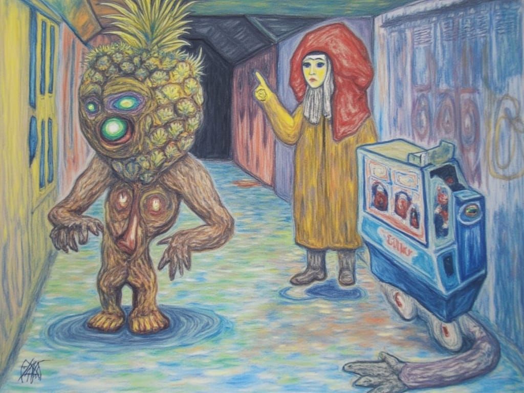 This surrealist oil painting depicts an anthropomorphic pineapple beggar facing a spectral nun in a grimy alley. The scene evokes religious dread with its disquieting colors and harsh lighting.