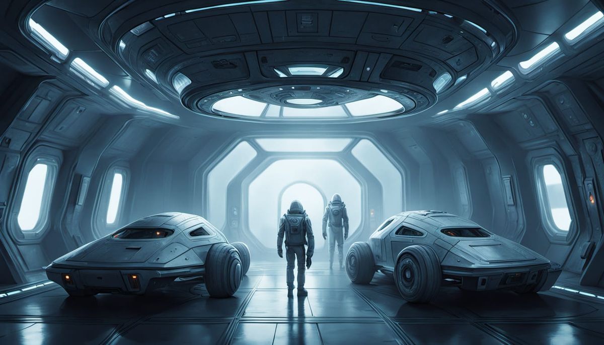 This detailed digital painting depicts frail, telepathic alien beings with large black eyes inside a spaceship. The scene features cool blue and silver lighting in a sterile metallic environment.