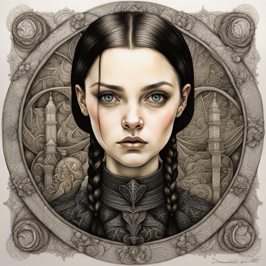 This image shows Wednesday Addams in a Zentangle-inspired line art design. The portrait is rendered with watercolor and ink, featuring dark nautical elements and full moon lighting in an expressive post-impressionist style.