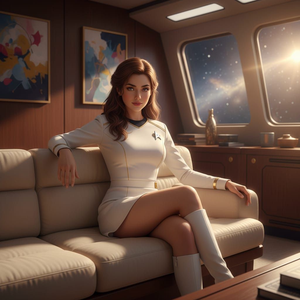 A photorealistic image of a beautiful Starfleet officer in her 20s, relaxing in a white uniform on a high-end space yacht. Features cinematic lighting and golden hour ambiance.