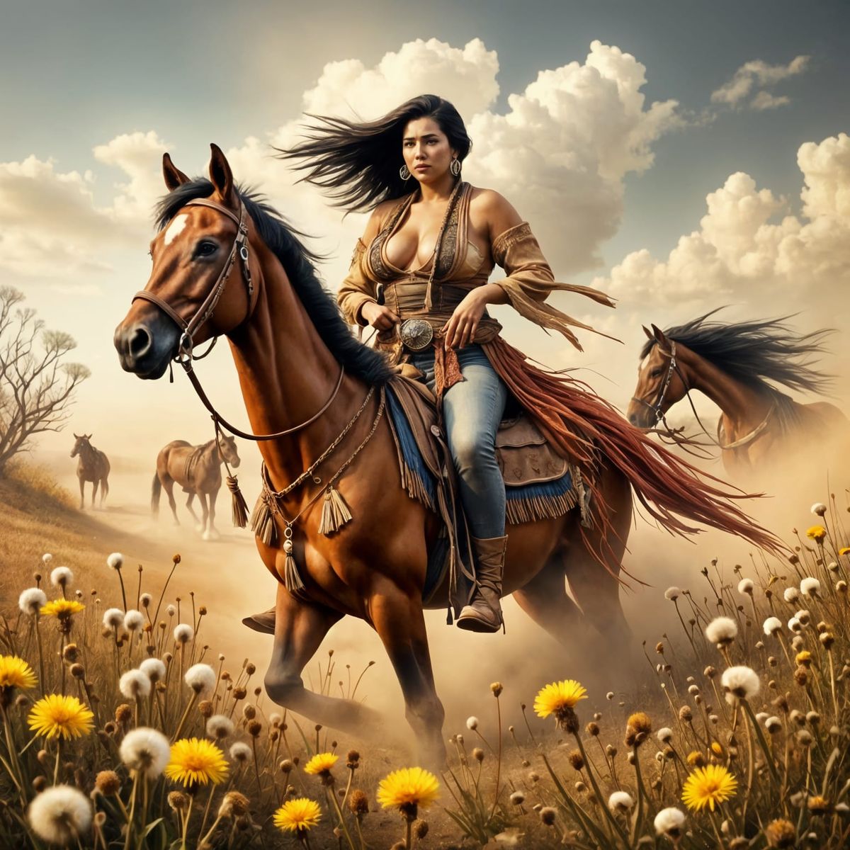 This image shows a dramatic and atmospheric scene of a bare-chested Native American woman riding a wild stallion in the old west, surrounded by swirling dandelions and captured in a vintage burn paper effect, reminiscent of cinematic film stills.