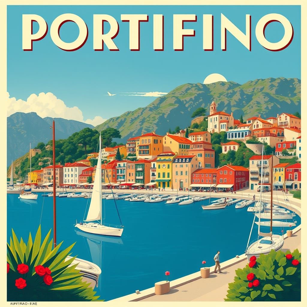 Make your own travel posters! Our AI image generator lets you create beautiful travel scenes of Portofino for free.