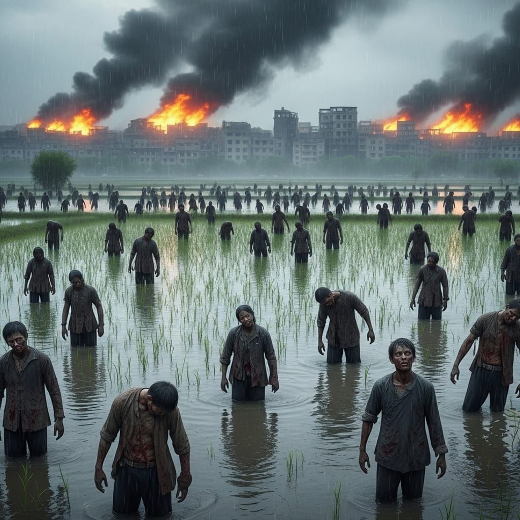 This image shows a photorealistic scene in Hallstatt with zombie workers in a rural field during a rainy early morning, rendered with hyperrealism.