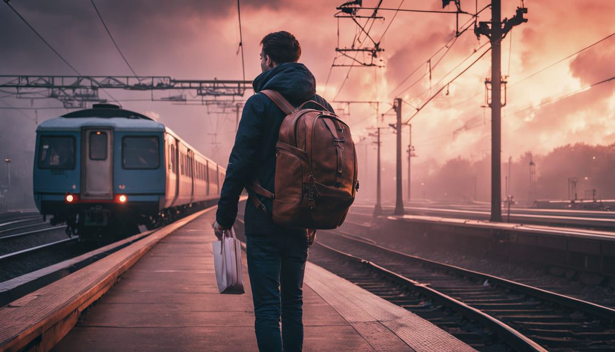 This image shows a young man with a bag and ticket standing on a train platform. Soft golden light illuminates his face in the misty, atmospheric scene as he is about to board a modern train.