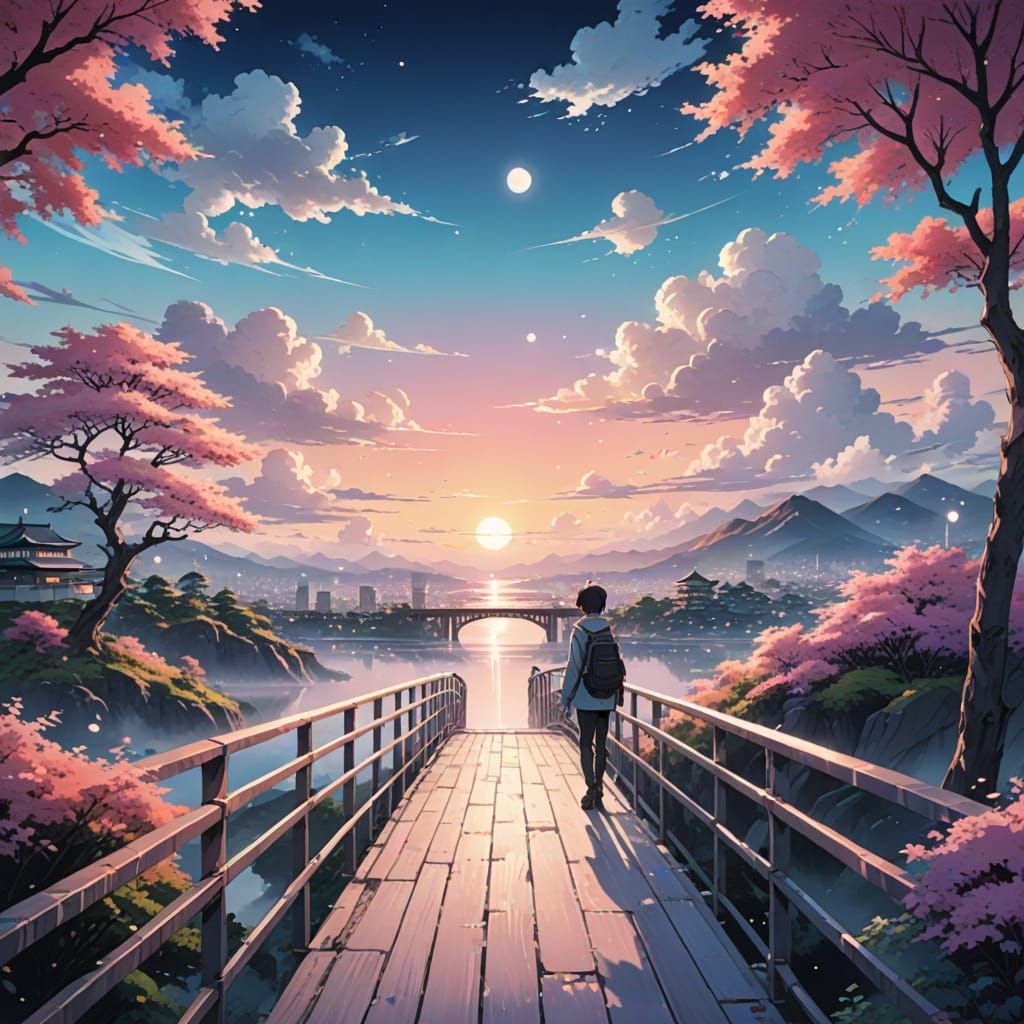 This anime-inspired image captures a lone figure standing on a bridge suspended high above a dreamlike void, bathed in warm, ethereal light and surrounded by vibrant pastel hues and delicate mist.