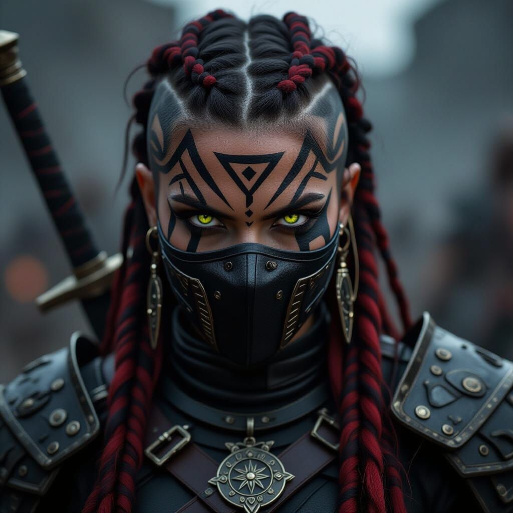 A close-up image of a fierce female warrior with striking golden-green eyes. She has intricate face paint and wears dark, textured armor. The background suggests a gritty battlefield in a cyberpunk aesthetic.