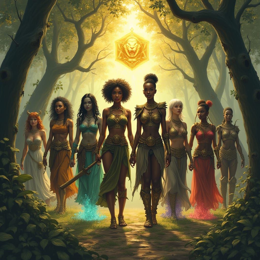 This image shows eight women warriors standing together in a whimsical forest. Each warrior has a distinct aura and energy, and they are all dressed in armor and warrior attire, painted with vibrant color palettes.