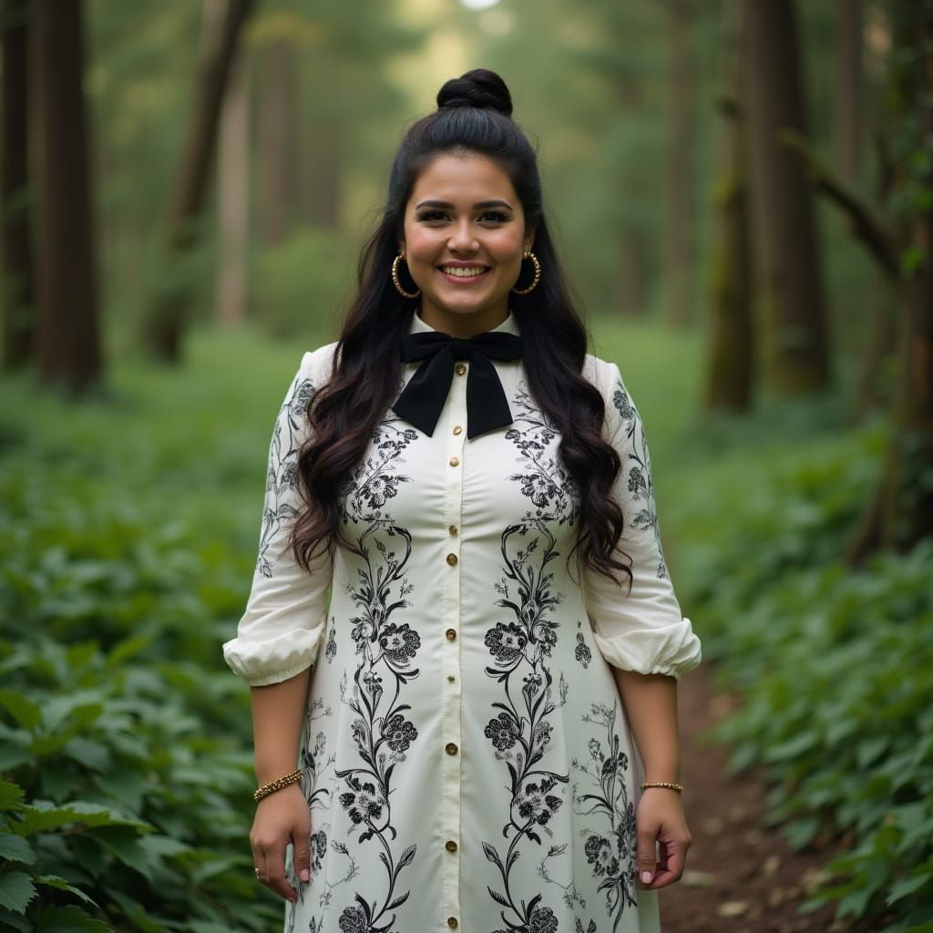 This image shows a plus-size Spanish teacher in an emerald forest. She wears a white dress with black floral patterns, white stockings, and black boots. This cinematic film still is richly detailed with atmospheric lighting.