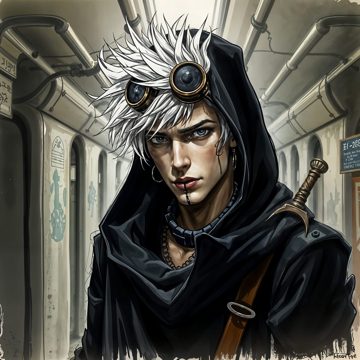 A charcoal sketch of a brooding steampunk man in a subway. He has white hair, piercings and goggles, and carries a rapier in this image that is reminiscent of Art Nouveau.