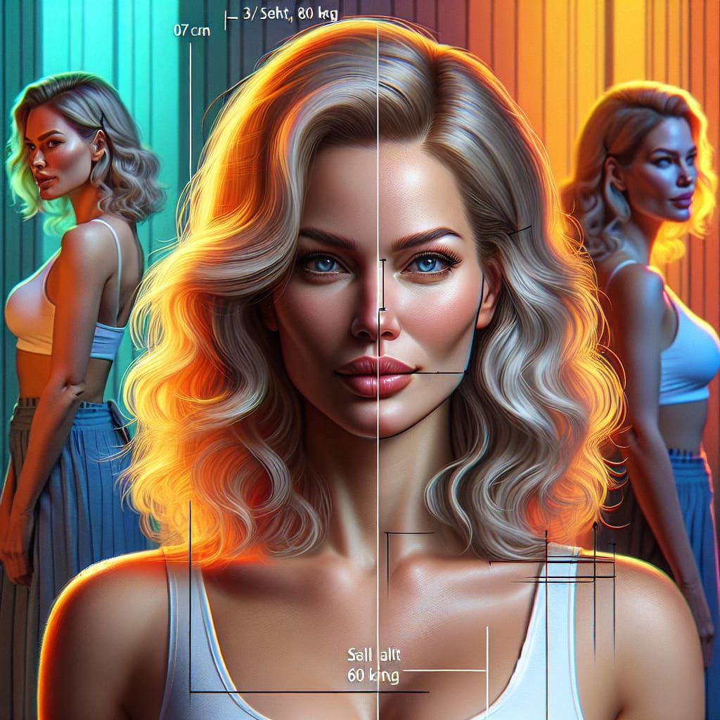 This hyperrealistic image showcases a 30-year-old blonde woman in two distinct body types: one at 80kg and another at 60kg. Both are captured with dramatic side lighting against a colorful, deep background.
