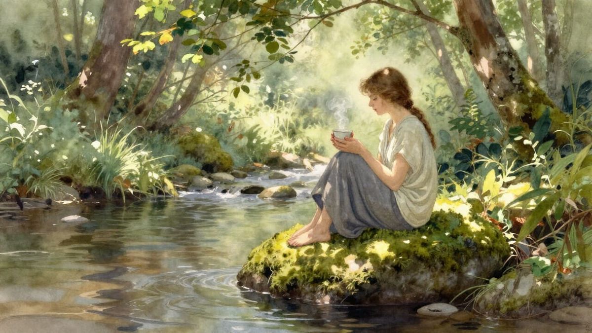 This image depicts a woman in a tranquil forest, holding a teacup by a stream. Rendered in a soft, ethereal watercolor style, it conveys a sense of rest and balance.