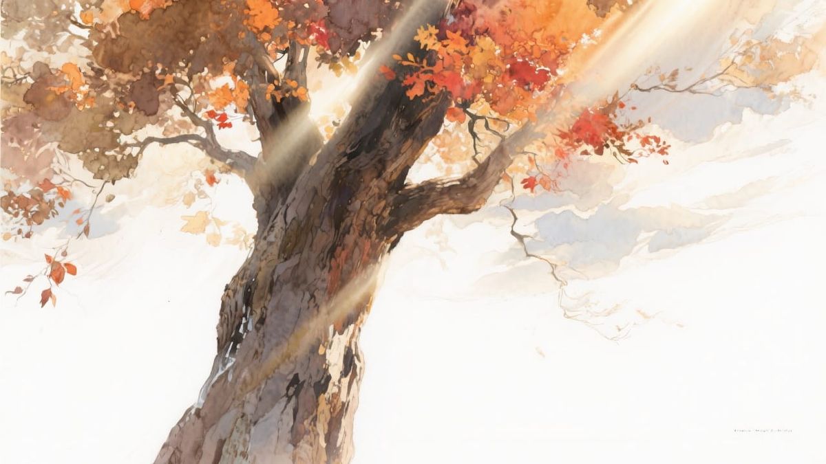 A striking picture of a large oak tree with vibrant fall foliage. The watercolor painting style features soft brushstrokes and a dreamy, ethereal aesthetic with bright sunshine beams.