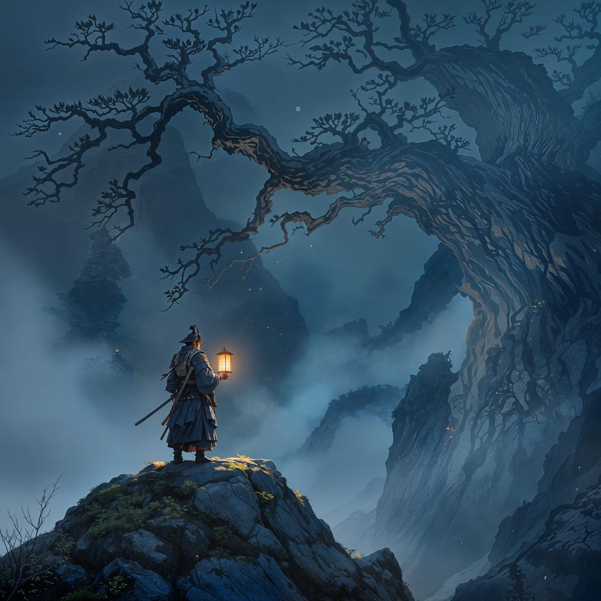 This image shows a lone samurai warrior on a misty mountain, holding a lantern. The artwork is reminiscent of traditional Ukiyo-e woodblock prints combined with modern digital painting techniques.