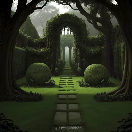A surreal maze of overgrown hedges conceals grotesque statues. The image evokes a dark, gothic atmosphere with deep shadows, creating a sense of unease, as a gothic illustration.