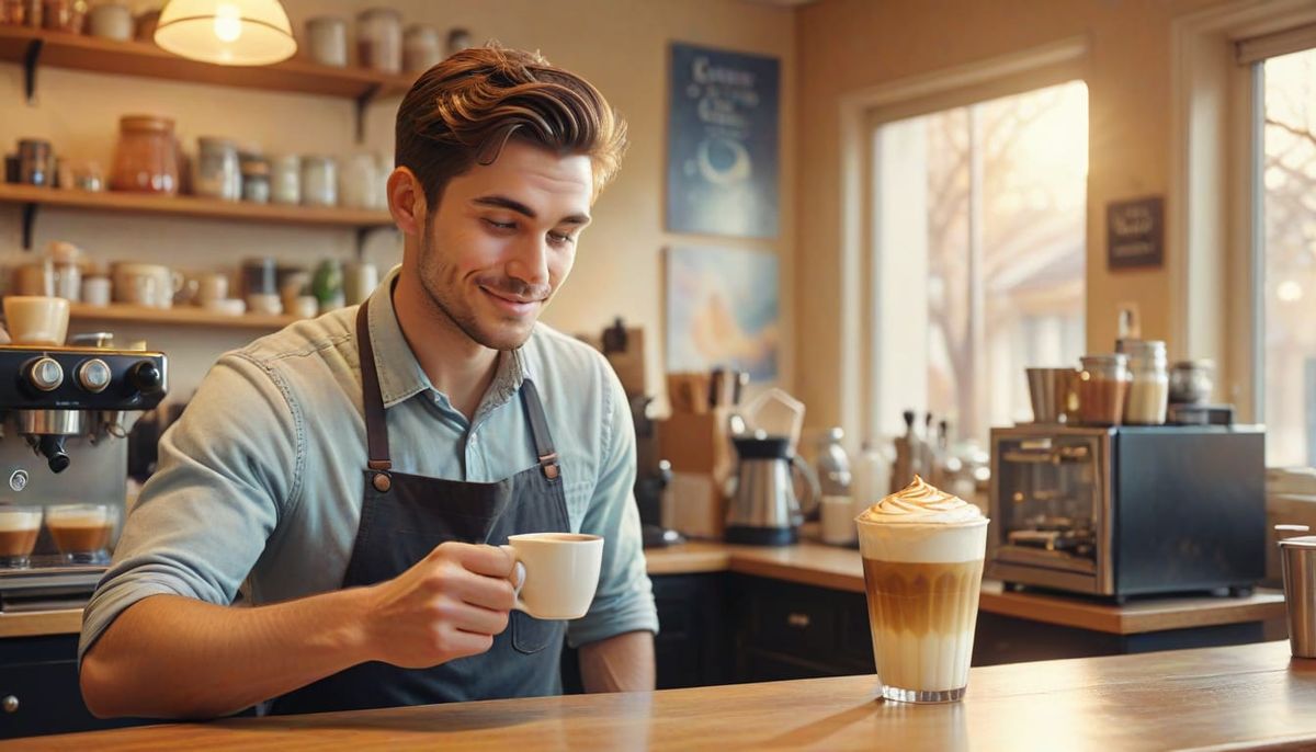 This image shows a cheerful young barista crafting a cappuccino. The digital art is styled with sparkling watercolor textures and pastel colors, illuminated by a warm, golden glow.