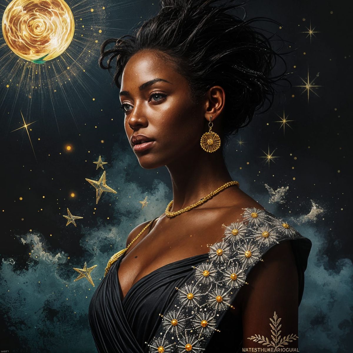 A striking picture of a sandstorm in the desert under a starry sky. A Black woman dressed in sand stands amidst the storm in a colorful graffiti art style.