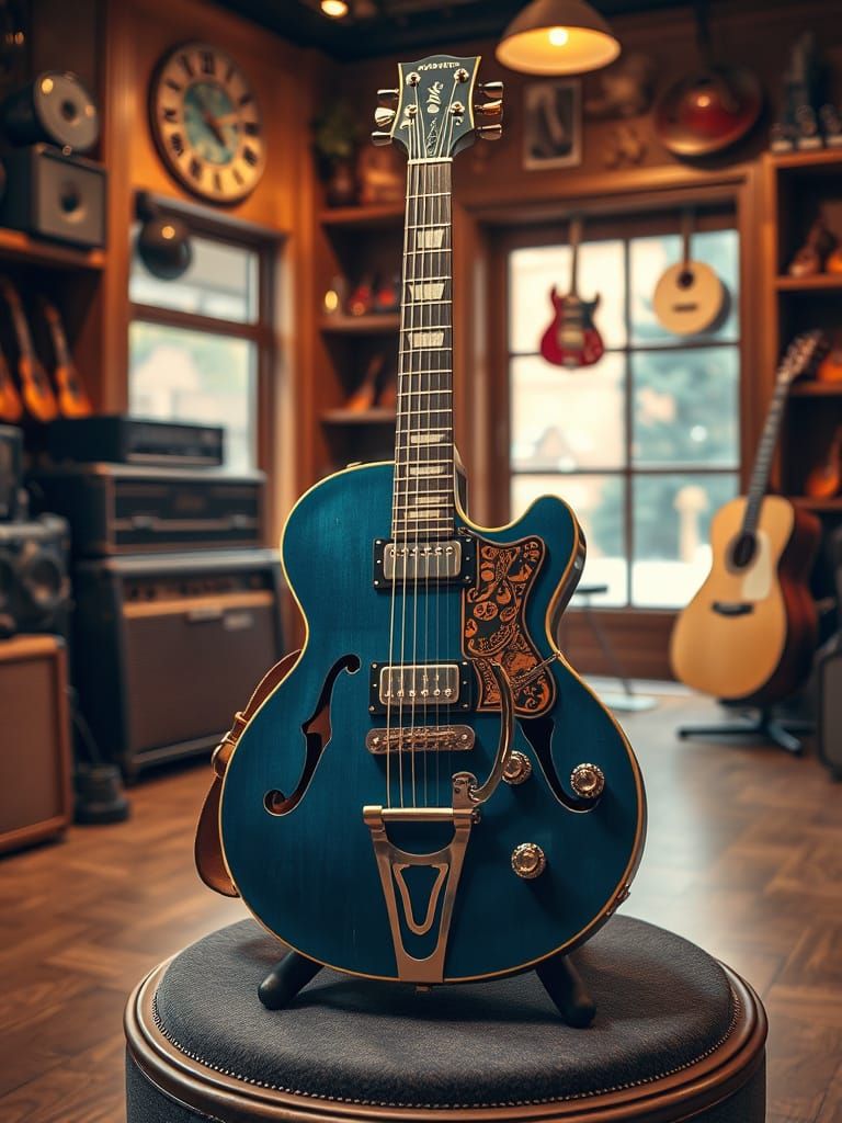 A striking picture of a blue vintage electric guitar displayed on a velvet pedestal in a music shop. Golden lighting and warm wooden accents provide a cozy retrofuturistic atmosphere.