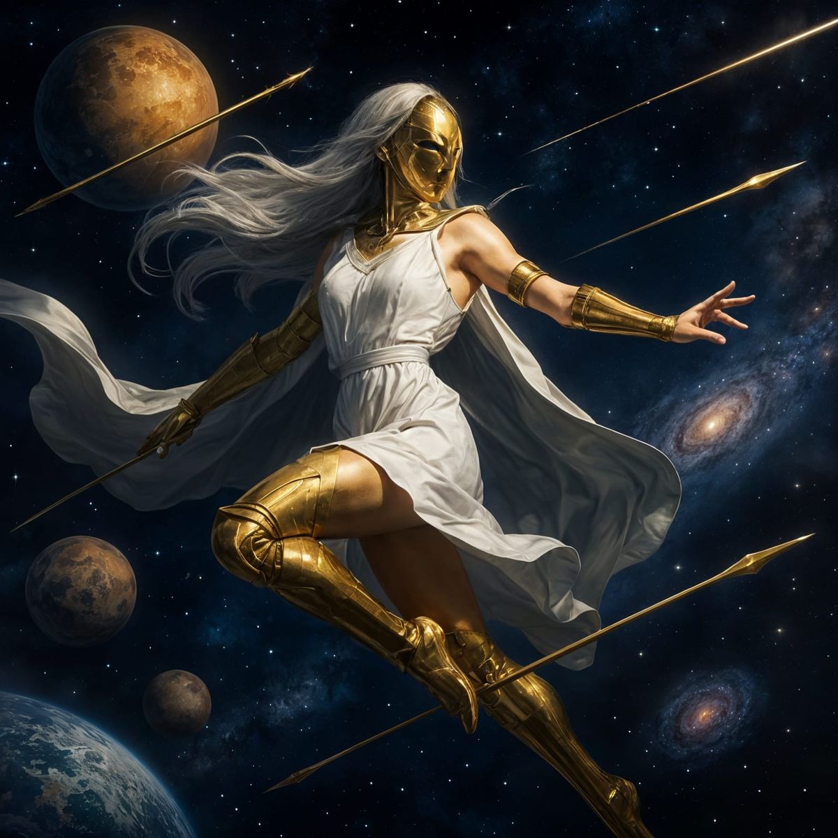 This image shows a celestial queen amidst planets and galaxies. She wears a golden mask and flowing silver hair, posed dynamically with spears flying by, all illuminated with dramatic lighting.