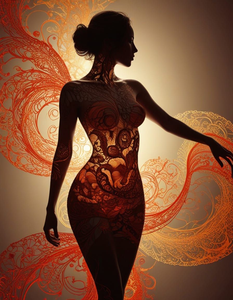 This image features a full-body silhouette of a sensual woman, beautifully rendered with abstract vector fractals and wave functions. It showcases hyperrealistic 3D shading in soft, color-graded red and gold tones.