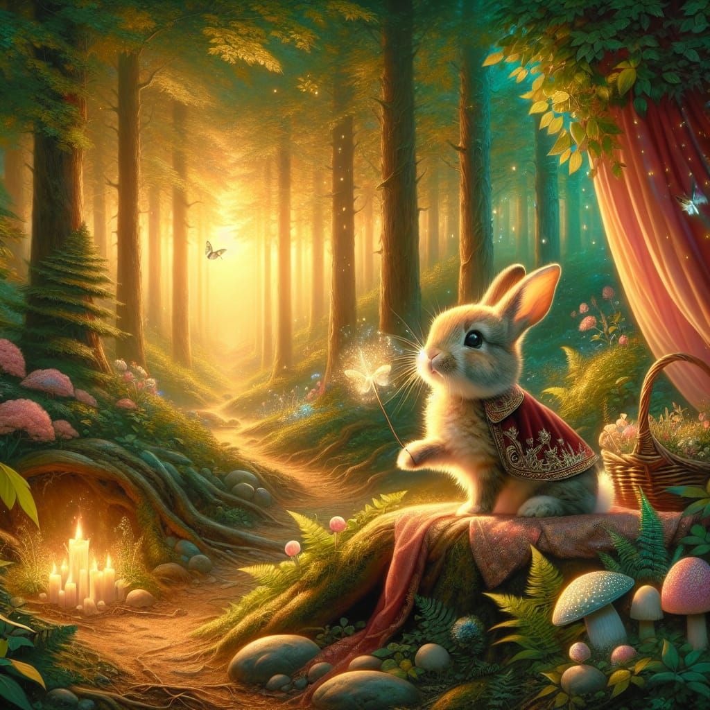 Create an image of a magical forest featuring a cute baby rabbit. This hyperrealistic digital painting should exhibit elements of fantasy and be brimming with intricate details, vibrant colors, and a perfect composition. The rabbit should be central to the scene, potentially holding something in its ...