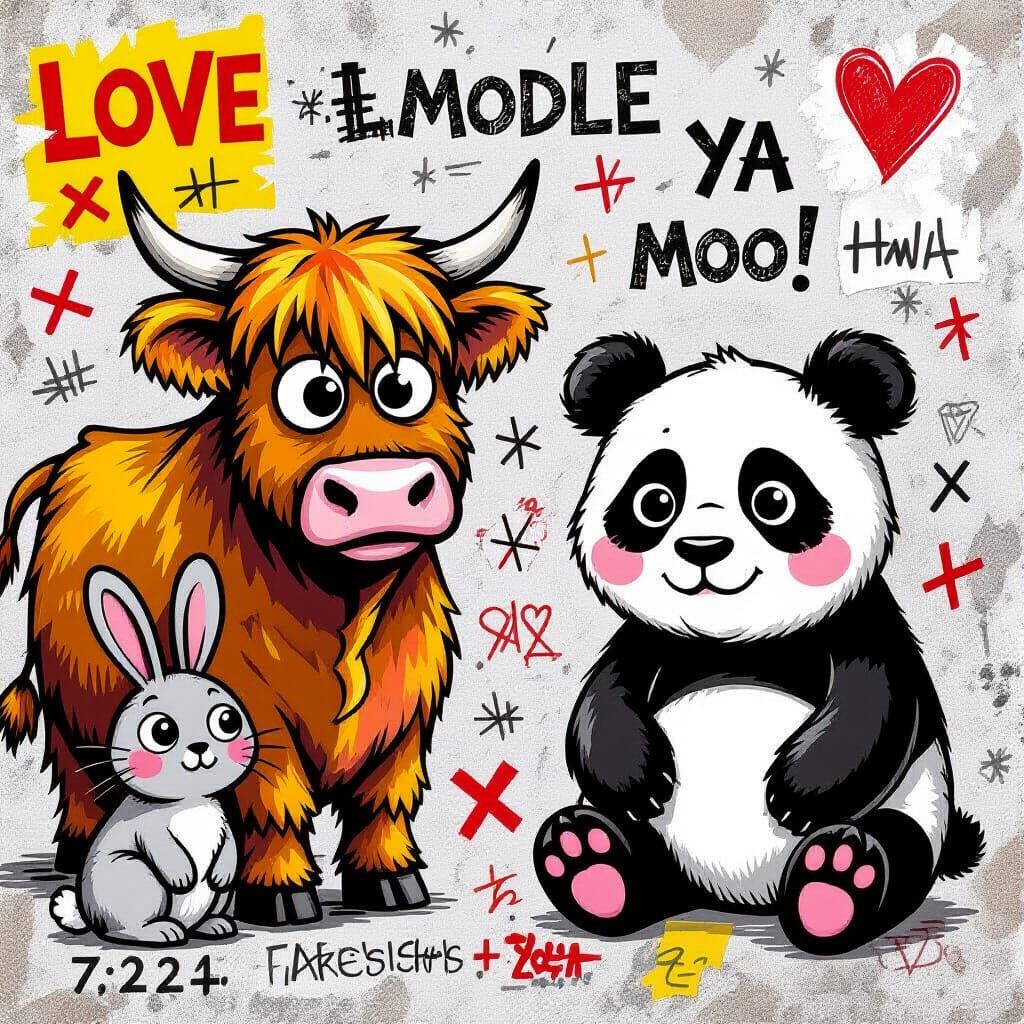 DOODLES, zig-zag thin and thick black lines, polka dots, playful neo-expressionist street-art collage featuring cartoonish, anthropomorphic animals like round wide-eyed highland cow, rabbits, and a playful rectangular panda's head. Use a raw, outsider-art drawing style with exaggerated features: big ...