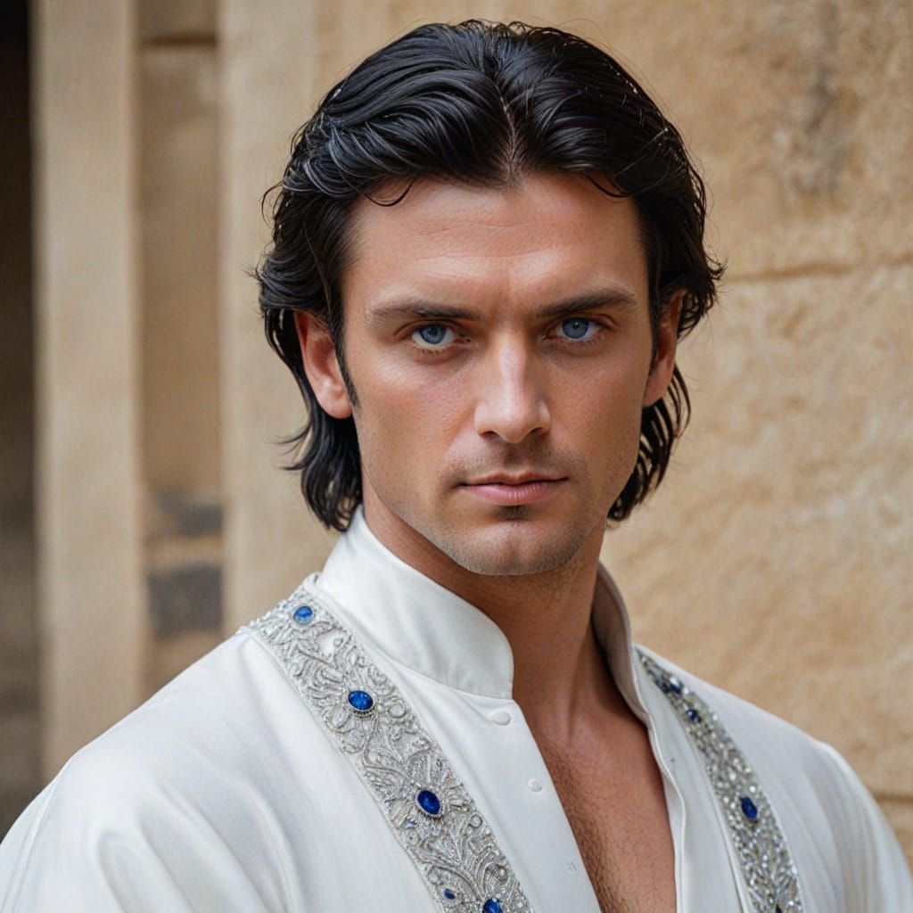 A striking picture of a man's face, featuring fiery black hair and piercing dark blue eyes. He is wearing a white gown.