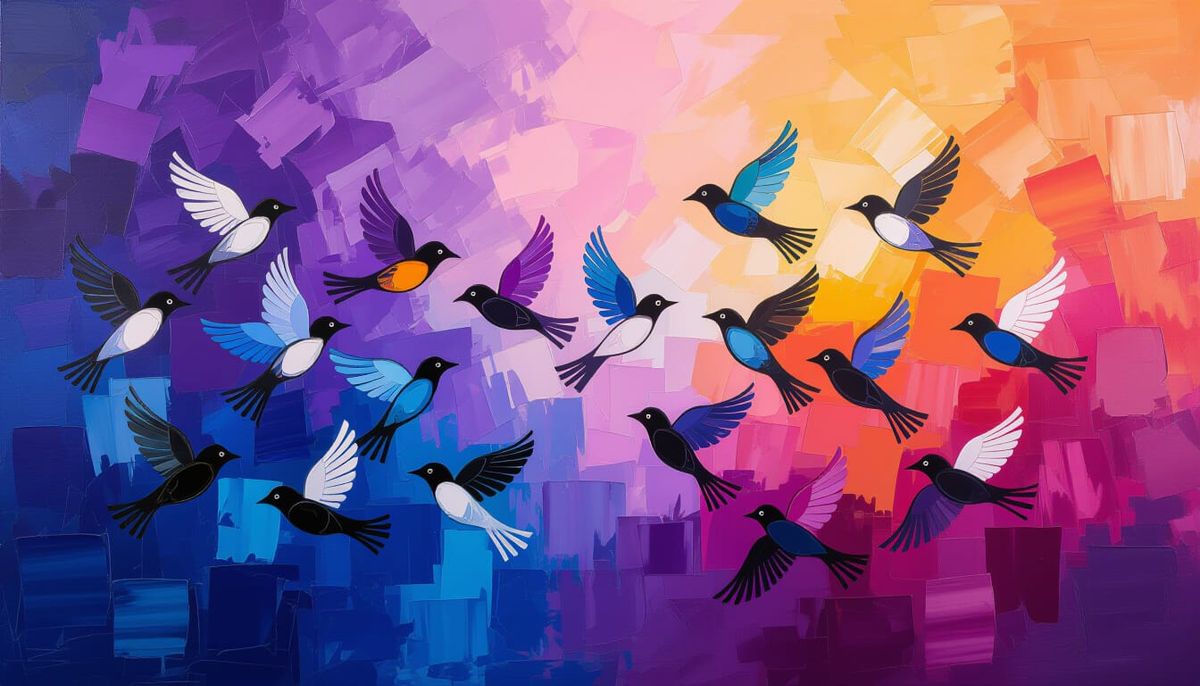 A vibrant painting of birds in flight against an abstract background. The artwork features textured brushstrokes and a dynamic color palette of purple, pink, orange, black, white and blue, in an abstract expressionist style.