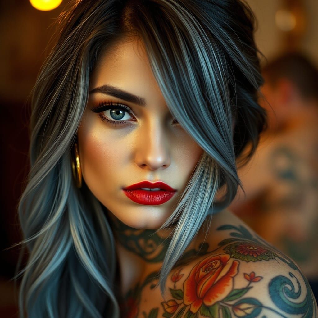 A striking picture of a woman with dark hair highlighted with blue. She has floral and portrait tattoos, red lipstick, and gold earrings. The image features soft focus and realistic shading as digital art.