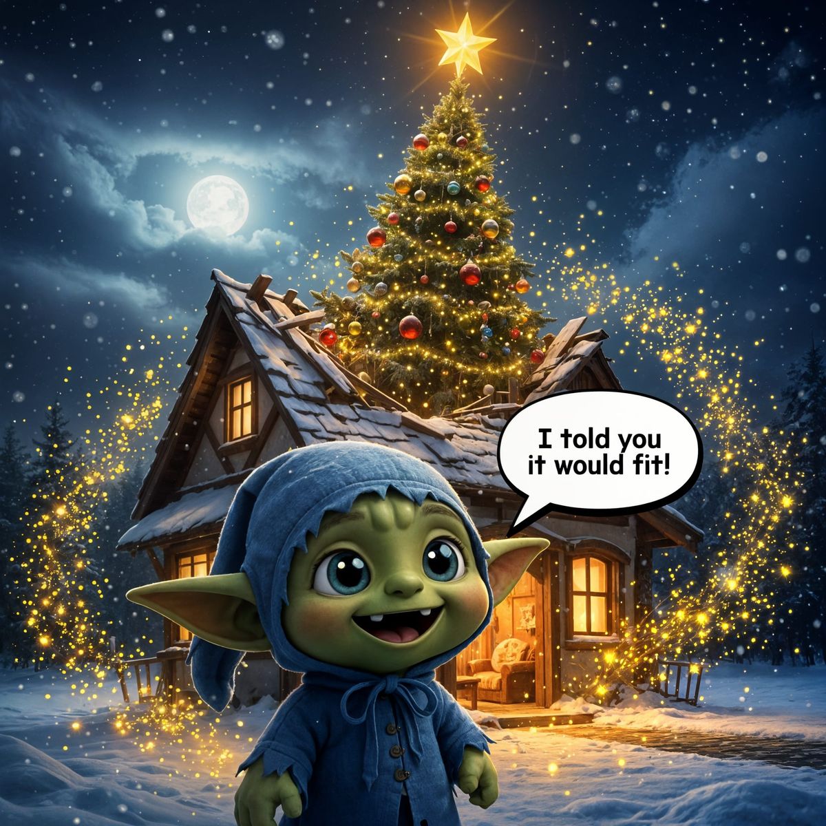 A little goblin is depicted. This character is incredibly cute. The goblin is wearing a blue, tattered, hooded cap, stands happily in front of his house on the street. In his house is a Christmas tree, the top of which has broken through the roof and towers above it. Chat bubble inscription "I told you ...