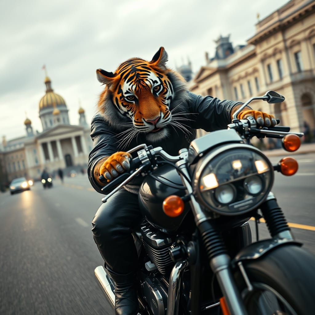 A striking picture of a tiger in motorcycle leathers riding a chrome motorcycle. This photorealistic image features a dystopian Saint Petersburg background and neon glitchcore accents with a dark whimsy.