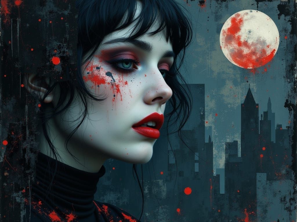 A striking image of a melancholy young Gothic woman in a moonlit, abstract setting, evoking a dark romantic aesthetic with a delicate, ethereal quality.