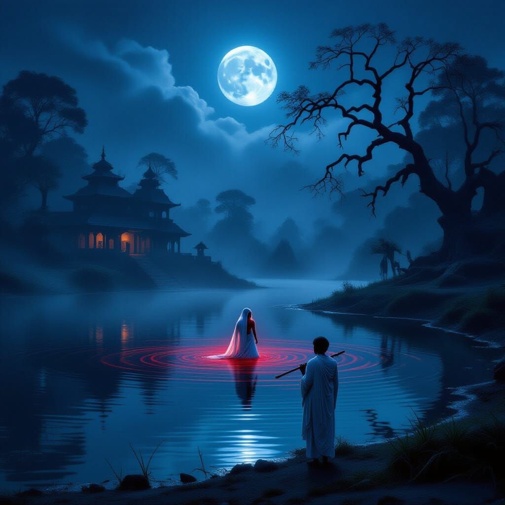This image depicts a cursed yakshini emerging from a glowing black pond in a misty, moonlit Indian village. A terrified shepherd watches as ethereal reflections shimmer on the water, creating an ethereal horror atmosphere.