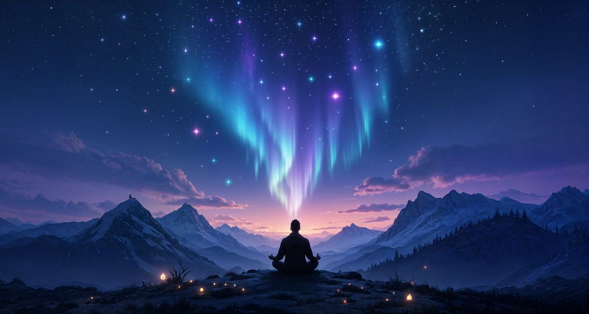 A person meditates in a mountain landscape under a dark sky filled with stars and glowing violet orbs. This digital artwork features intricate detail and deep, complementary colors.